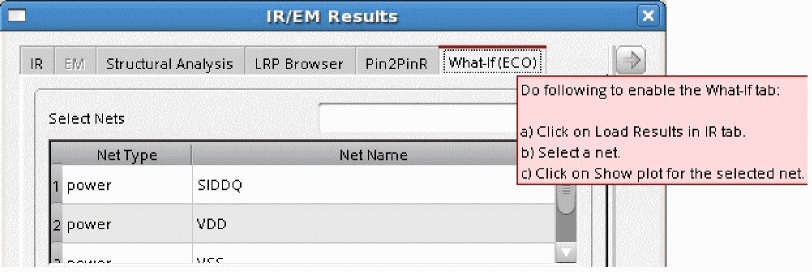 To perform What-If analysis, first load the IR drop analysis results, select the net and click Show Plot. In the IR/EM Results form, the What-If (ECO) Analysis tab gets enabled. The software provides support in the form of tips about how to enable the What-If (ECO) tab when you hover over the tab name. This is shown below. It also provides help to fill out information in the various fields in the tab. This tooltip appears when you hover over the fields in the form.