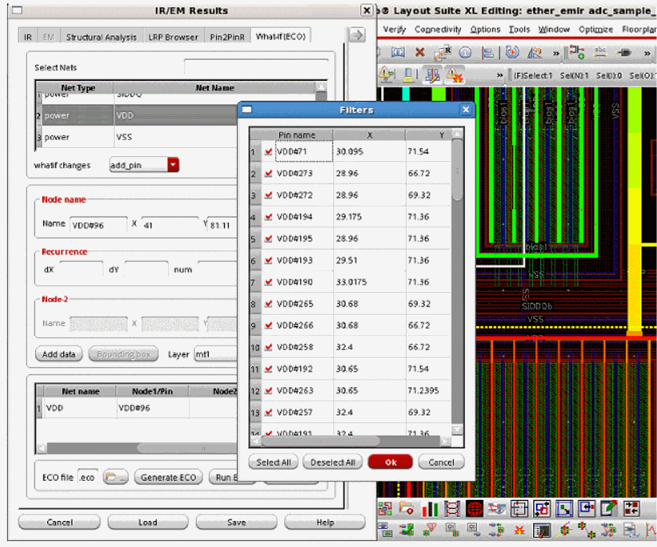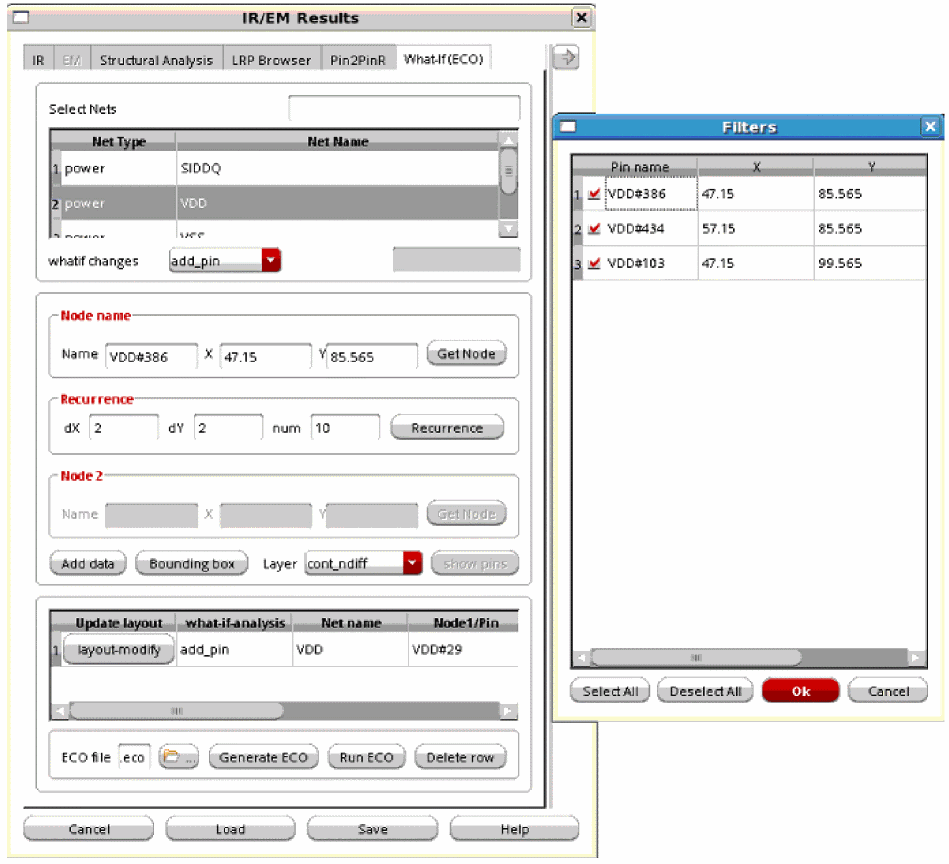 delete_resECO command is selected in the whatif changes list, resistors will be selected for deletion. The nodes and resistors are selected on the basis of the specified layer name. These nodes will be listed in the Filters pop-up window. When you click OK, all the selected nodes will be used for deleting resistors. Ifadd_pincommand is selected in the whatif changes list, then all nodes inside the rectangle, for the specified layer, will be selected. These nodes will be listed in the Filters pop-up window. When you click OK, all the selected nodes will be used for adding pins. Their names and the corresponding net names will be added in the table in the What-If (ECO) form.The Bounding Box can only be used whenFigure 10-4 Using the Bounding Box Option to Add Pinsadd_pin,add_cap,delete_res, andscale_resECO commands are selected in the whatif changes list. An example of using the Bounding Box for adding pins is shown below.