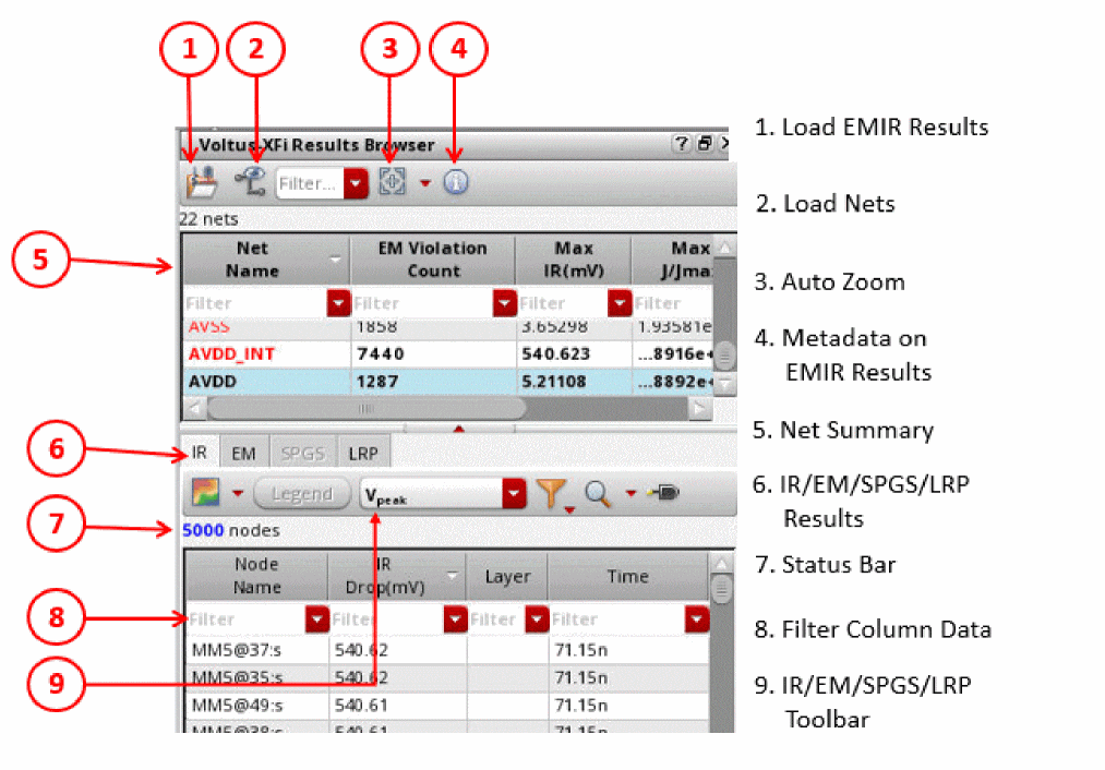 The following section explains the Voltus-XFi Results Browser interface: