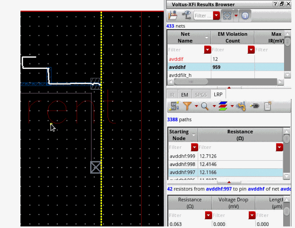 The Voltus-XFi Results Browser lets you visualize and debug the EM IR results generated for a design.