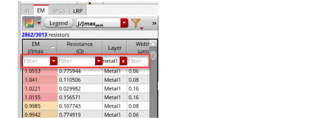 Filter Column Data - The Filter field on top of each column heading allows you to filter column values based on the string you enter. Example: If you have 695 rows appearing in the EM tab and you want to filter out the layer metal1, enter metal1 in the Layer field. The EM tab displays only those rows with layers starting with metal1.