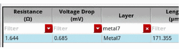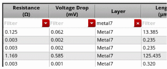 Allows to view the combined resistance values for a layer in the resistance path table. When this option is clicked, all the resistors on a layer, metal or via, will be merged into one segment for the purpose of LRP reporting. In the image below, the resistors on layer Metal 7 are shown in the resistor path table.