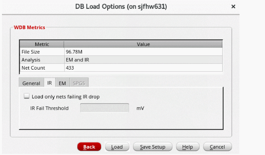 - Select the Load only nets failing IR drop option and then enter a value in the IR Fail Threshold field to load nets with IR drop higher than the specified value.