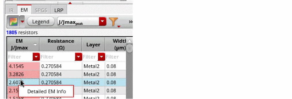 To view and compare EM details of multiple resistors in the same EM Detailed Information window, right-click the required row in the EM tab and click Detailed EM Info again. This step should be repeated for each resistor that you want to view.