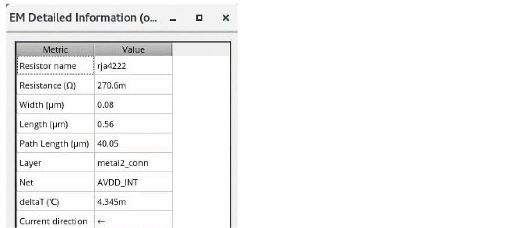 When Detailed EM Info is selected, the EM Detailed Information window opens and displays the EM details of the selected resistor.