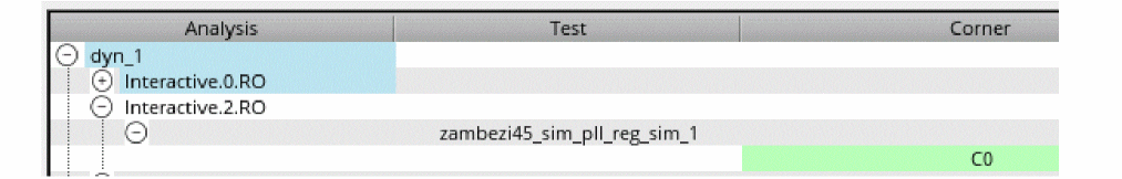 Hover your mouse pointer over the name of an analysis to view the analysis type, over the history item to view its timestamp, and over the corner name to view its status (simulation passed/failed), timestamp, and the path to the history directory.