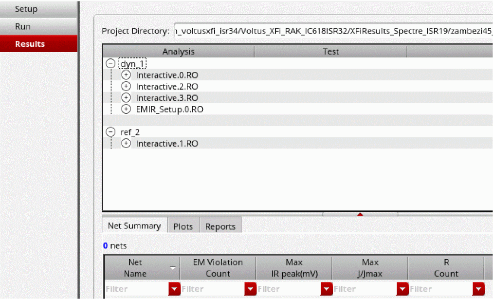The Results tab in the Voltus-XFi GUI allows you to preserve the history of simulation results. Using this feature, you can view and load multiple simulation results corresponding to the saved history items. The file naming convention for history items is according to the maestro history name, that is, the default is Interactive for the active setup of the view and user-specified name for the setup state of the view. In the following image, Interactive.0.RO, Interactive.1.RO, Interactive.2.RO, and Interactive.3.RO are names of the history items for the active setup of the view, and EMIR_Setup.0.RO is the name of the history item for the setup state of the view.