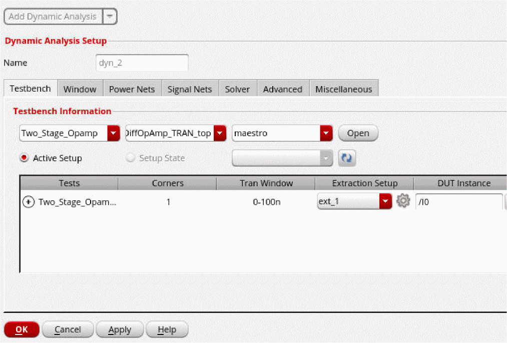 - You can view the testbench setup in ADE by clicking Open next to the maestro cellview.