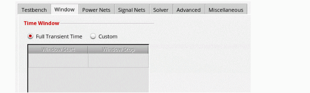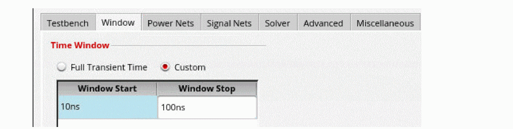 On the Window tab, specify the time period for EM-IR analysis, either the full transient analysis time or a subset of the transient analysis time.