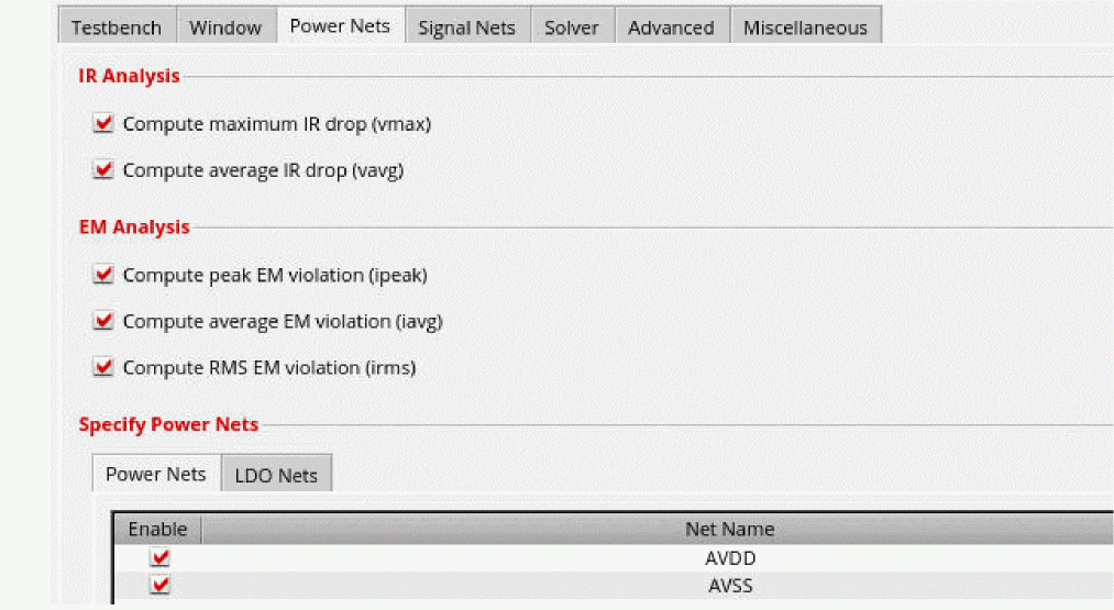 On the Power Nets and Signal Nets tabs, select the IR/EM analysis options and nets that you want to include in the analysis.