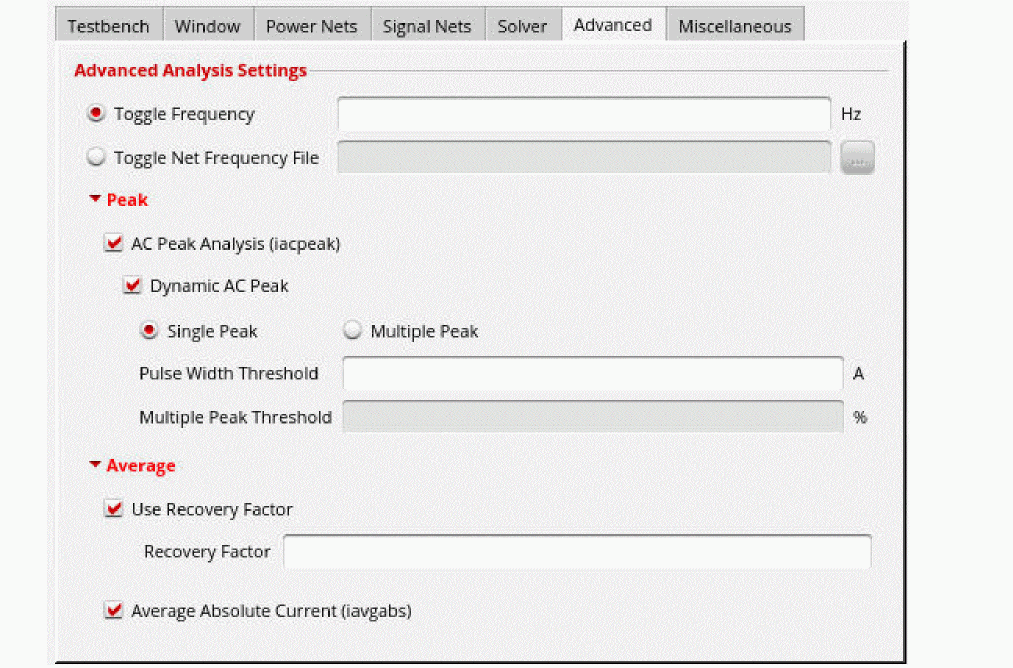 On the Advanced tab, specify the toggle net frequency and select the analysis types from the available options in the Peak and Average sections.
