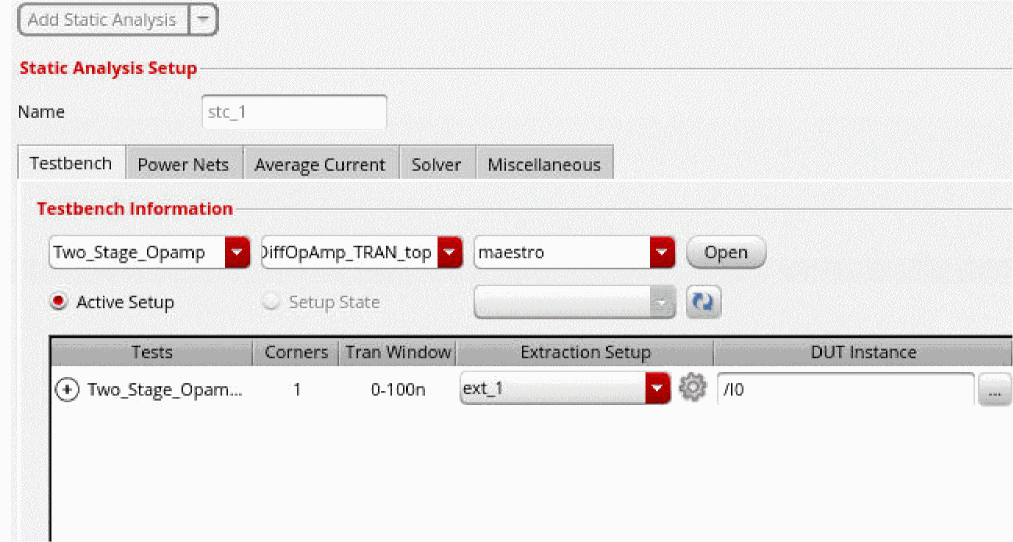 - You can view the testbench setup in ADE by clicking Open next to the maestro cellview.
