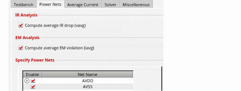 On the Power Nets tab, select the IR/EM analysis options and nets that you want to include in the analysis.