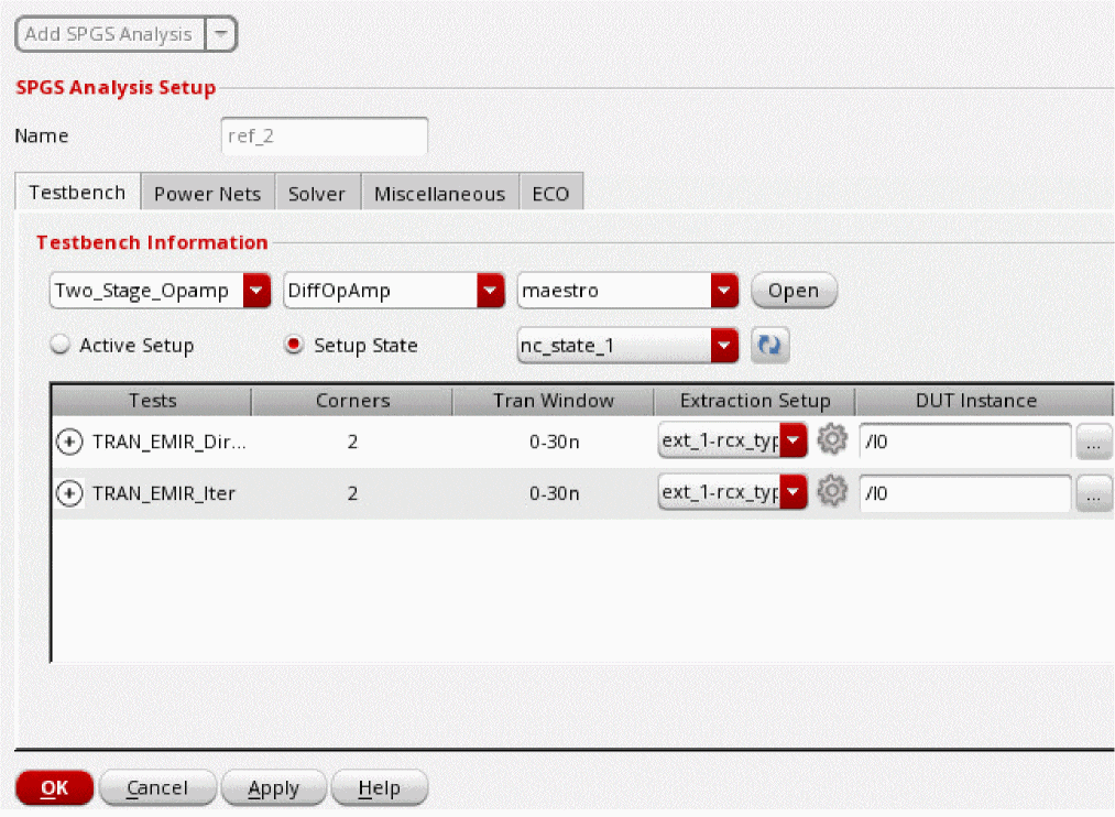 Select Static Power Grid Solver or SPGS Analysis from the drop-down list, and click Add SPGS Analysis.