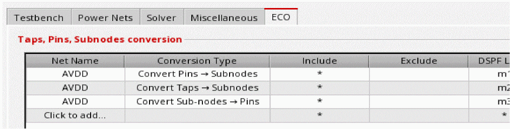 On the ECO tab, select the net name, conversion type, tap/pin/node to be included and excluded, and the DSPF layer name. You can specify * to include all items to be converted. The Include field should not be empty.