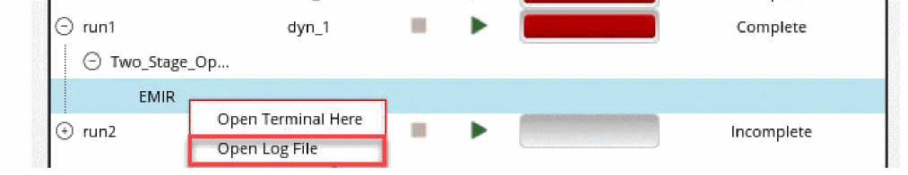 You can check the log file for the simulation run from within the Voltus-XFi interface by right-clicking the analysis run name and selecting the Open Log File option.