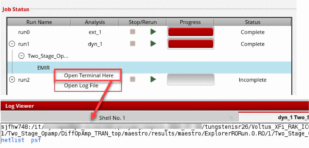You can open the simulation output directory from within the Voltus-XFi interface by right-clicking the analysis run name and selecting the Open Terminal Here option.