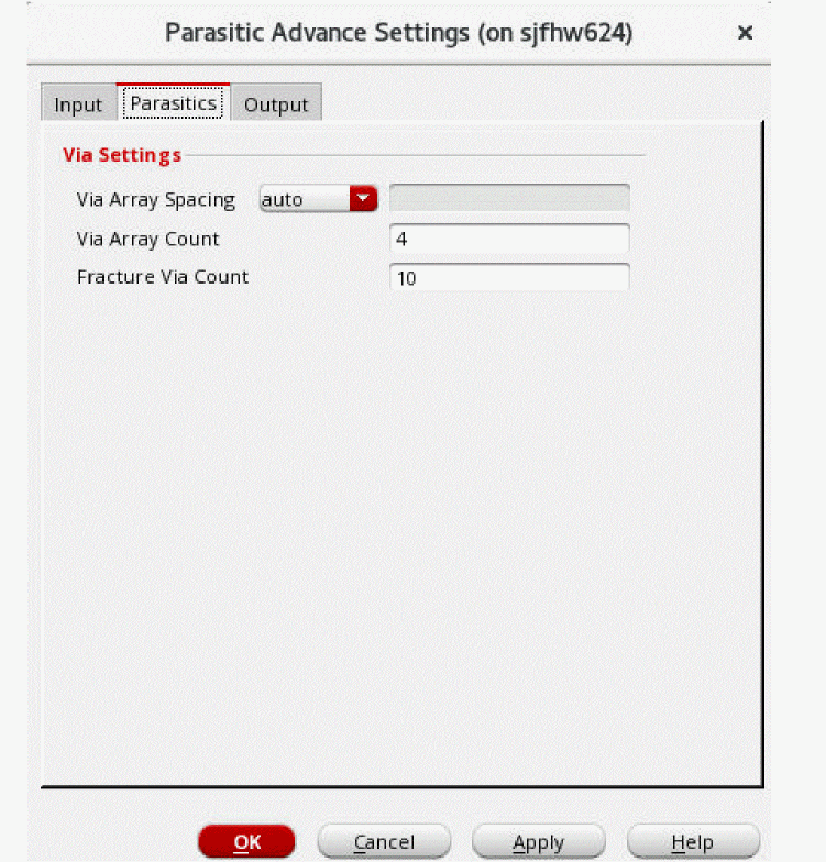 On the Parasitics tab, select either auto or manual from the Via Array Spacing list.