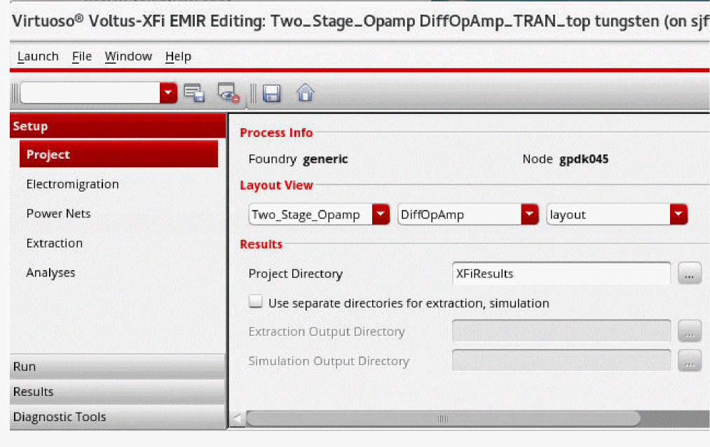 - In the Results section, specify the Project Directory in which the results need to be saved. The default directory name is XFiResults. The Voltus-XFi default directory will have the following structure: XFiResults/lib_name/cell_name/view_name.