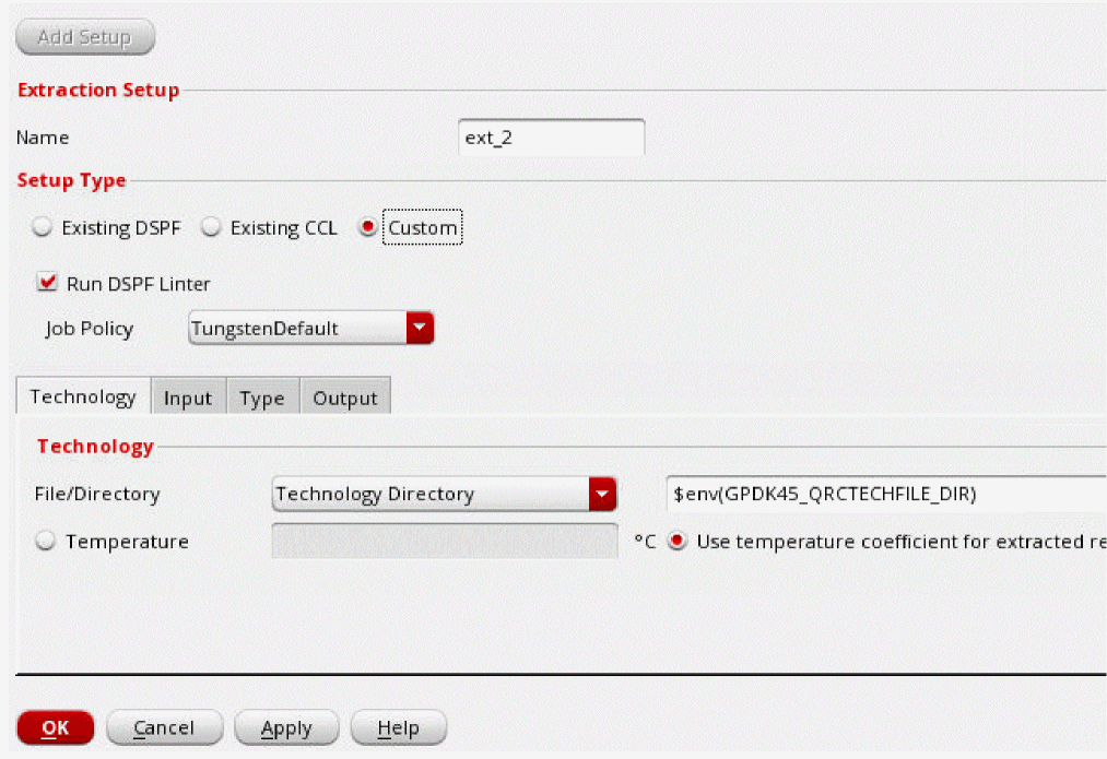 - Specify the temperature at which the extraction will be performed, or select the Use temperature coefficient for extracted resistors check box if you want to use the simulation temperature to compute parasitic resistance.
