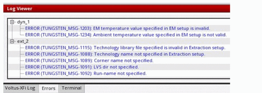 Error - displays warning or error messages pertaining to the extraction setup, analysis setup, and simulation runs. The messages are grouped under the specific run names.