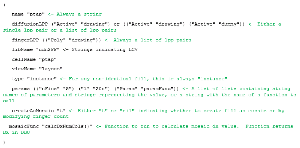 diffusionLPP parameter can be either a single layer-purpose pair or a list of layer-purpose pairs. The fill definition fingerLPP parameter is always a list of layer-purpose pairs.Here is an example of a SKILL procedure: