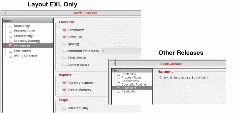 Choose Placement in the Check panel. The Placement options are displayed in the right panel of the form. The options on the Placement tab available in Virtuoso Layout EXL cockpit in advanced node releases is different from the options available in all other releases. The following snapshots show the differences: