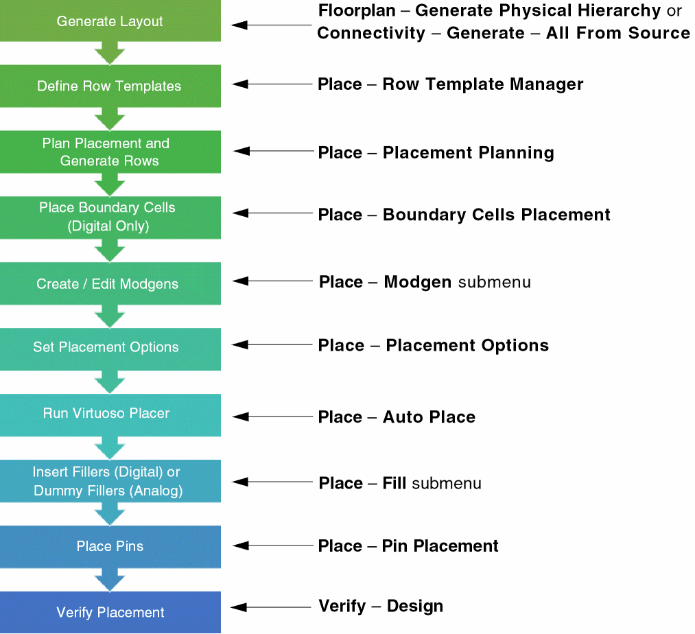 Virtuoso Placer is a unified, powerful placement solution that supports placement of different types of designs, such as digital designs with only standard cells, analog designs with only devices, and mixed designs that contain a mixture of both. The following figure depicts the Virtuoso Placer flow and maps each step to the corresponding Virtuoso feature.