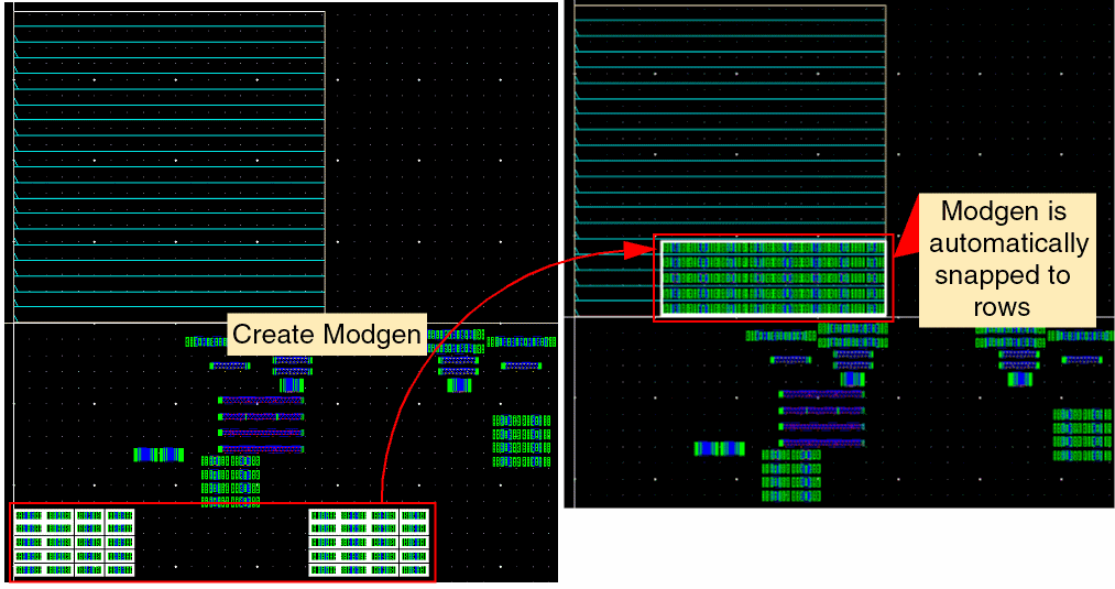 When you run Virtuoso Placer, Modgens are automatically snapped to compatible rows, if they exist. If the Modgen instances do not align exactly to the rows, then one of the Modgen instances is snapped to the nearest row. Use the snapFigGroupRowCorrect to control the snapping behavior of Modgens.