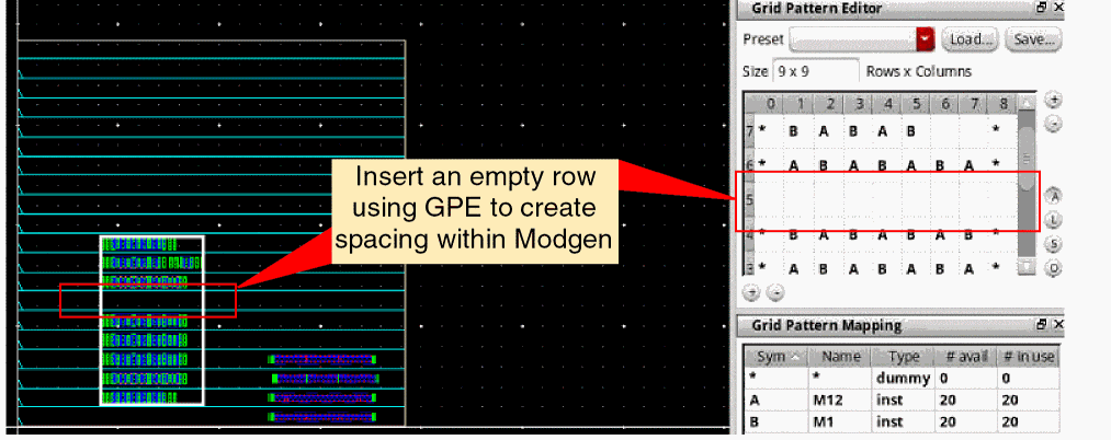 The Grid Pattern Editor (GPE) and Grid Pattern Mapping (GPM) assistants are available on-canvas. The Modgen grids directly map to the rows in the layout canvas. Therefore, whenever you make changes to the grid pattern, the Modgen instances always snap to the nearest rows.