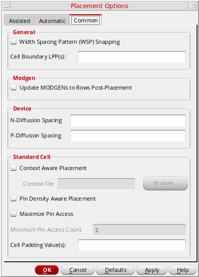 The Common tab of the Placement Options form provides settings that are common to both Assisted and Automatic placement.