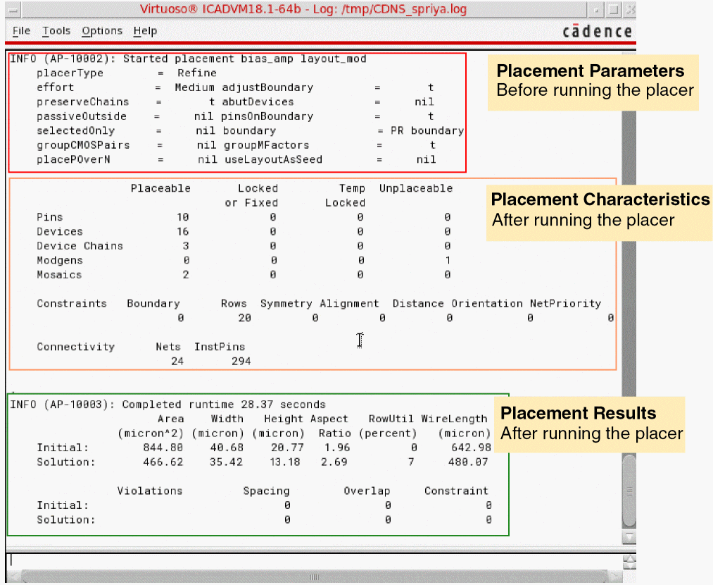 - Placement Results: Summary of the initial placement and the final placement achieved, followed by a list of errors and warnings (if any). The number of spacing and overlap violations is also listed.