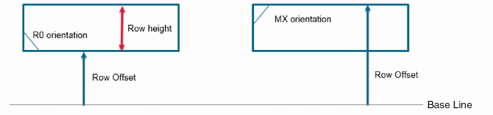 The reference edge depends on the row orientation. When the row orientation is R0, the reference edge is at the bottom and the row offset is the distance from the base line to the bottom edge. However, when the row orientation is MX (mirrored), the reference edge is at the top and the row offset defines the distance from the base line to the top edge, as indicated in the right-hand figure.