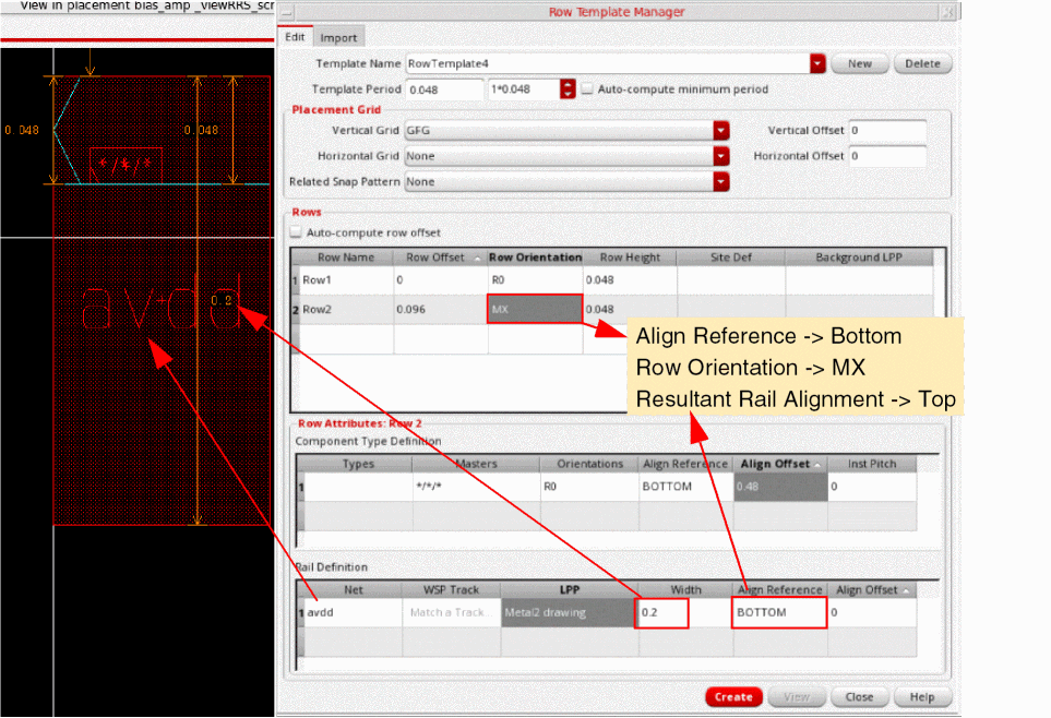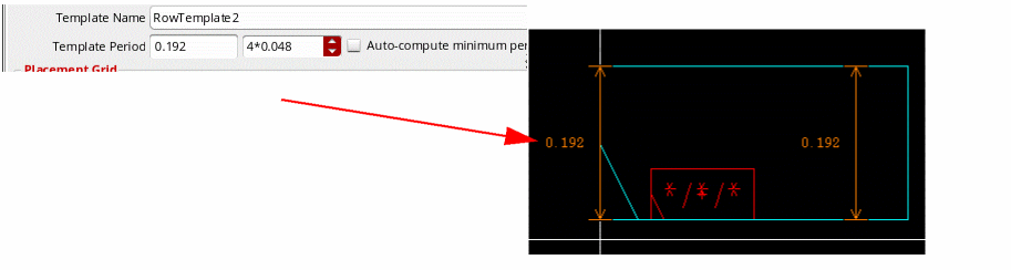 4*0.048indicates that the Template Period is four times the vertical grid's period (0.048). Therefore, the Template Period field is automatically reset to0.192to accommodate the vertical grid. - Specify the Region Type, which is a RowRegionSpec (RRS) type attribute from which settings are inherited. After generating the row region in the layout canvas, Virtuoso can automatically query the RRS type attribute, derive the predefined actions, and run these actions on the new row region.