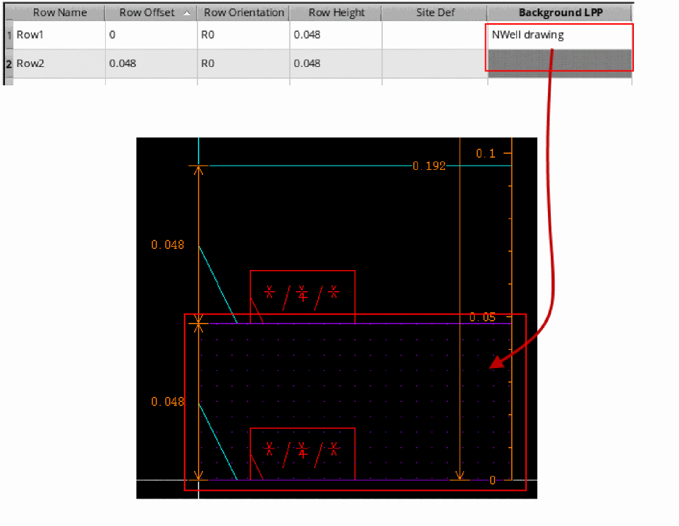 Select a Background LPP to fill the given row with a rectangle on the specified layer-purpose pair (LPP). This option is useful when you want to use well layers. You can use either an Nwell row with a Pwell behind it, or a Pwell row with an Nwell behind it. In the following example, an Nwell layer is selected as the Background LPP:
