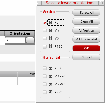 R0, the component orientation is followed as specified. However, if the row orientation is set toMX(mirrored) and the component orientation is also set toMX, then the devices are flipped twice, and so the resulting orientation isR0. Click the Browse button to select from the list of supported orientations.