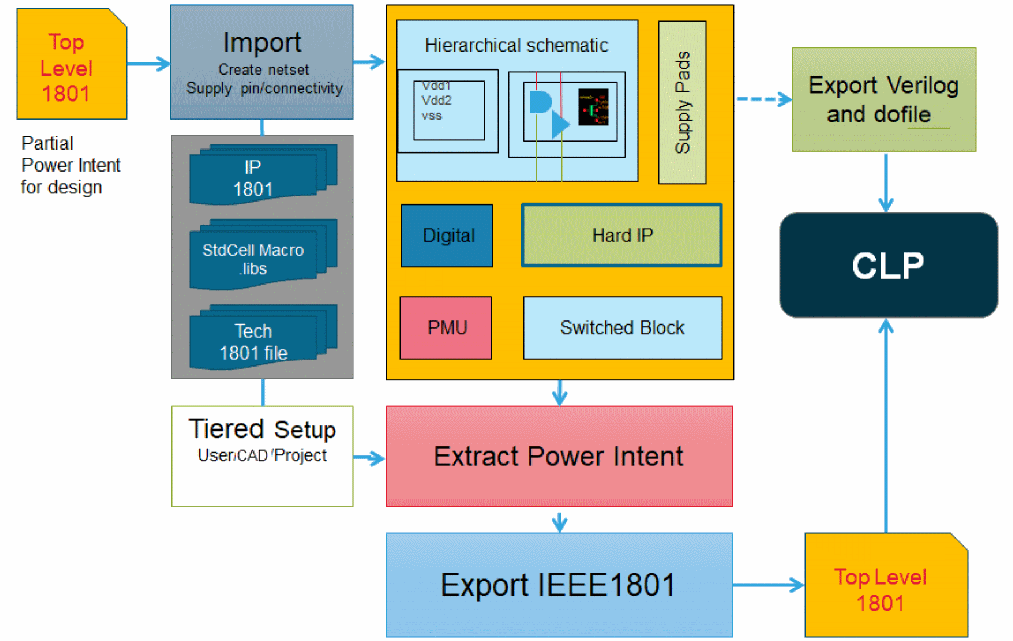 Virtuoso Power Manager provides an interface to specify, import, and export low power intent for designs. It provides the capability to perform static low power verification on designs by using Conformal Low Power (CLP) integration with Virtuoso and supports analog, digital, and mixed-signal implementations.