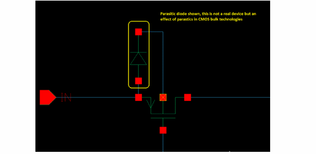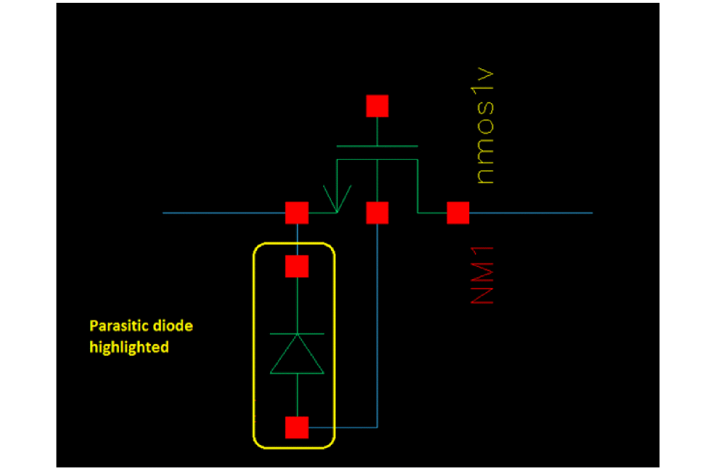 A parasitic diode is formed between the source or drain terminal of a MOS device and the bulk terminal. Here is an example of a PMOS device and a parasitic diode.