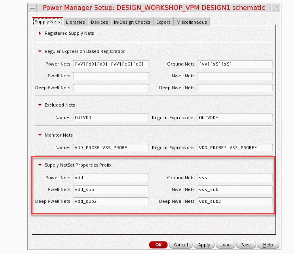 Registration of supply net properties includes identifying and registering of supply nets by using the property name prefix for inherited connections that have been specified in the Supply NetSet Properties Prefix section on the Supply Nets tab of the Power Manager Setup form.