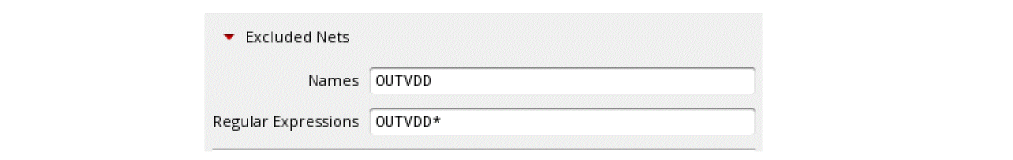 Use the Regular Expressions field in the Excluded Nets section to specify one or more power or ground regular expressions that have been registered using the Regular Expression Based Registration section or defined using the signal type.