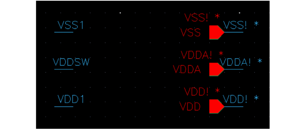 The following illustration shows the output for the supply port VDDA import when createPinsOnImport has been set and Resolve Top netSets is deselected.
