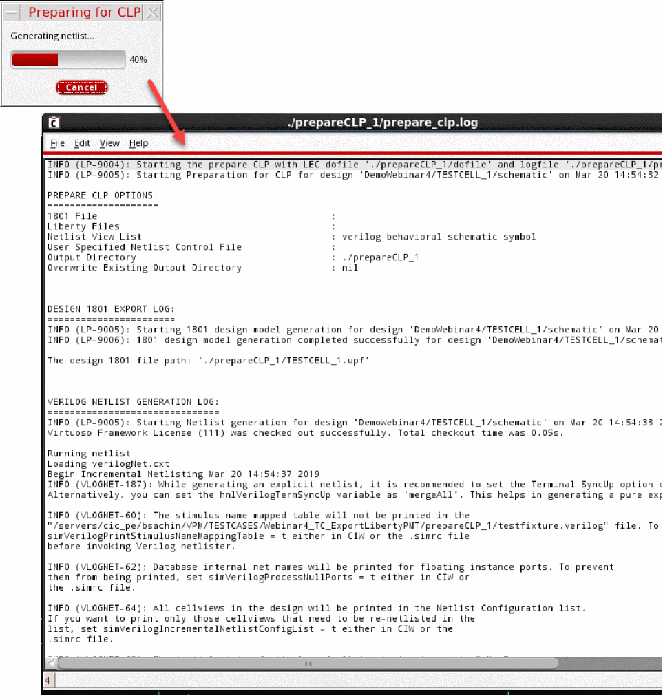 The 1801 File and Liberty Files field do not require explicit user inputs, if a setup template file already exists and is loaded for the cellview to extract and verify the power intent.The netlist generated by the Prepare CLP form is different from the general netlist created by NC-Verilog. This netlist includes a list of Verilog stub views for the macro models, single supply analog modules along with their power and ground pins, and the blocks that are binded to the existing power intent (1801). This makes the netlist more compatible with CLP. The log file generated, after the preparations for the CLP run are over, displays the results along with the following details: - Click Run CLP to start CLP and use the files created during CLP preparation, for power verification. The CLP run initiates when you click OK.