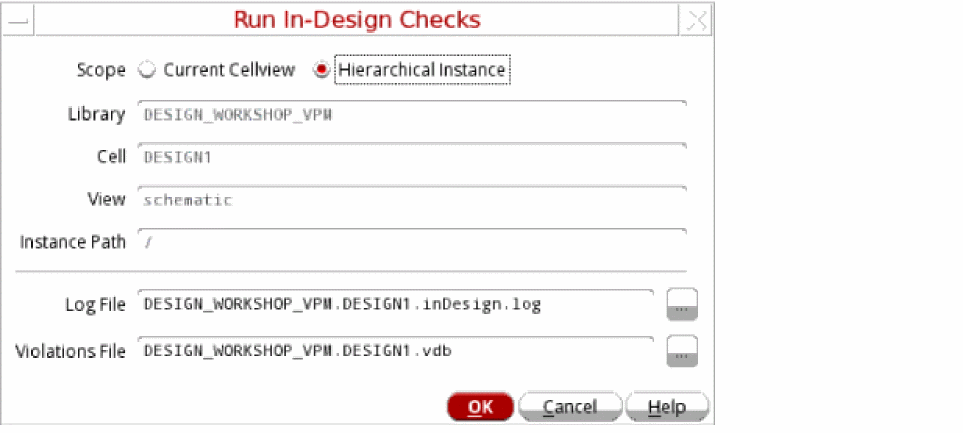 If you are making changes to a part of an existing design and you want to know how the changes in the hierarchy affect the accuracy of the design within that sub-hierarchy, you can validate a portion of the design by choosing the Hierarchical Instance option in the following scenarios:- You have a Power Manager setup for the top-level design, which includes all relevant information about supply states, supply nets, net voltage, and so on.