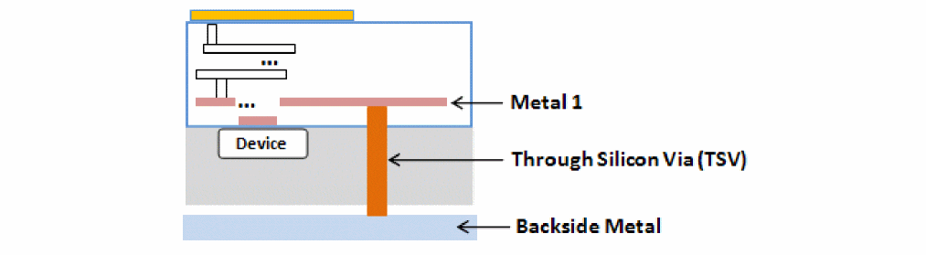 TSVs are copper vias with diameters ranging between 1 and 30 microns that pass through a silicon substrate.The top cap layer of a TSV is the first normal routing layer, Metal1, and the bottom cap layer of TSV is the backside metal layer. Therefore, TSVs enable signal propagation and power delivery between the top metal layer and the backside metal layer.
