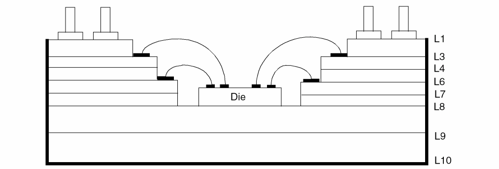 The stackup also provides the z-axis aspect of the electrical design, allowing for accurate positioning of conductive trace layers, power/ground layers, bond wire information, I/O pin position, and z-axis connections between trace layers or to a power or ground plane.