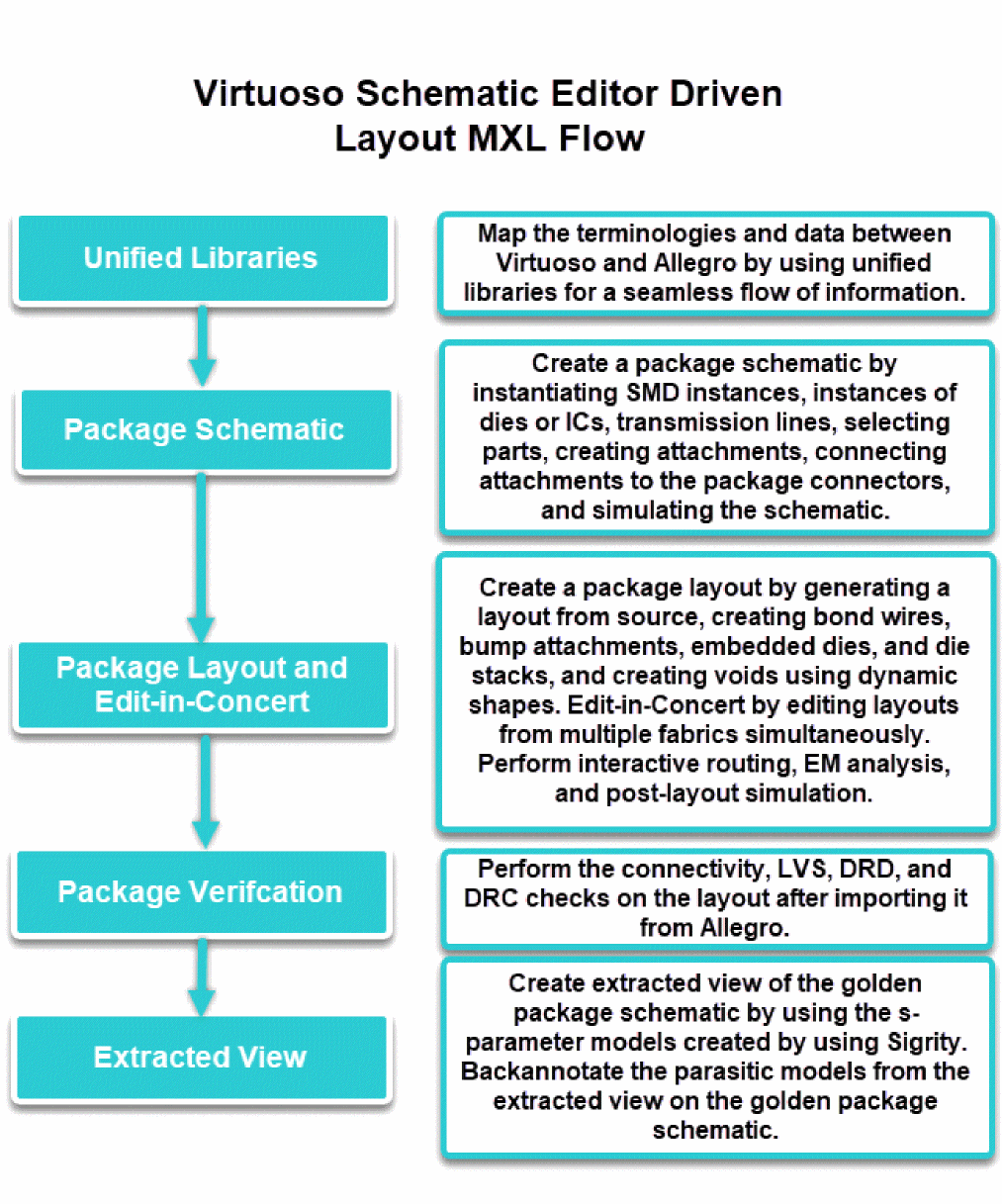 Teams that are used to the Virtuoso Studio can benefit from this flow. This flow enables the package designers to assemble and simulate the package on one platform. You can create a package layout by generating a layout from source and creating bond wires, bump attachments, die embedding, die stacks, and voids using dynamic shapes. Layouts from multiple fabrics are co-designed simultaneously. You can perform interactive routing and EM analysis using Clarity 3D Solver or EMX Solver. Additionally, the extracted view, which is created using S-parameter models, is annotated back to the golden package schematic.