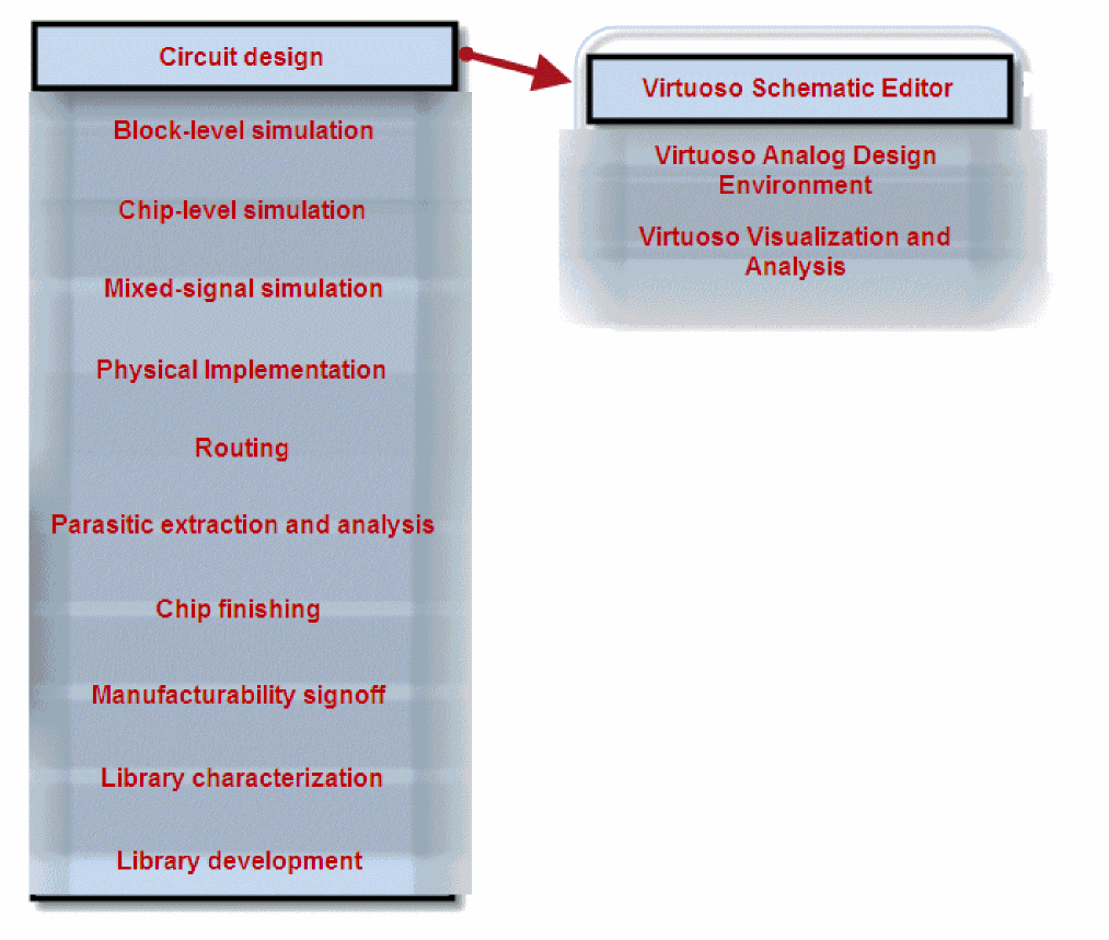 The following diagram shows how the shortcut methods of improving productivity while creating or editing a schematic fit in the overall Virtuoso Design Flow: