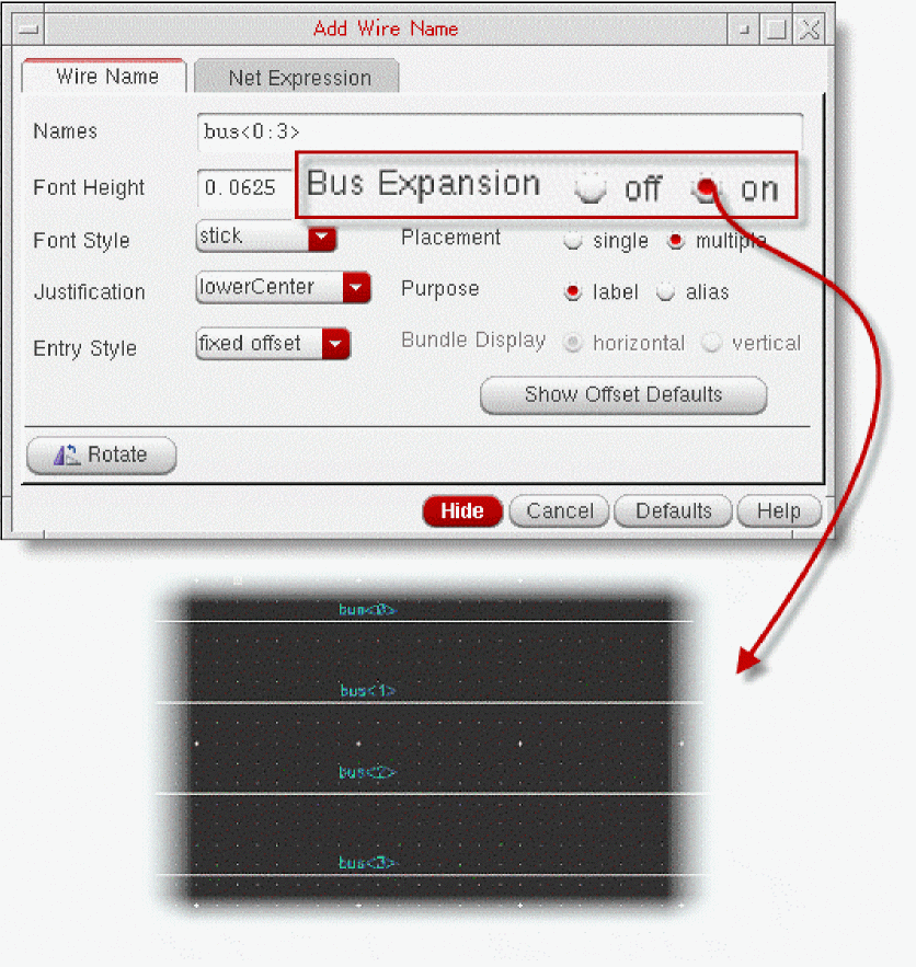 In the Add Wire Name form, enable Bus Expansion to automatically create a wire label with the expanded bus name and connect the bus name to the wire.