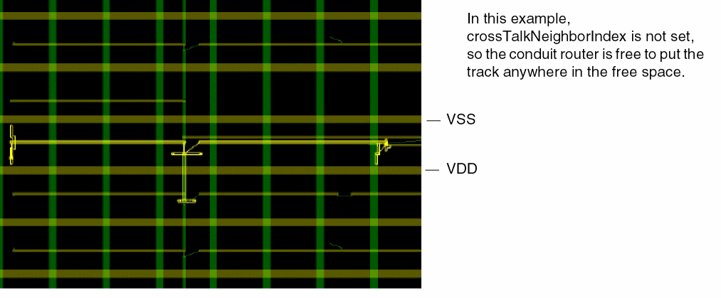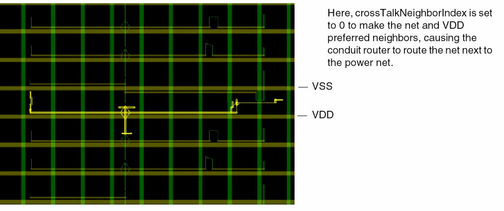 To avoid crosstalk between nets, specify nets in one group that must be routed at a distance from the nets in a second group, and set the crossTalkNeighborIndex group-to-group constraint to 2. Alternatively, the same group of noisy nets can be given for both net groups, as is done in the Crosstalk Control Example, so that the conduit router will try to avoid assigning any pair of the given nets as immediate neighbors on adjacent tracks.