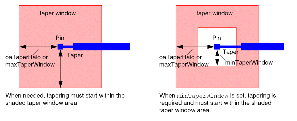 maxTaperWindowor its OpenAccess equivalent,oaTaperHalo, to specify the maximum distance from the pin where tapering must start, if tapering is needed. If bothoaTaperHaloandmaxTaperWindoware given,oaTaperHalois used. -